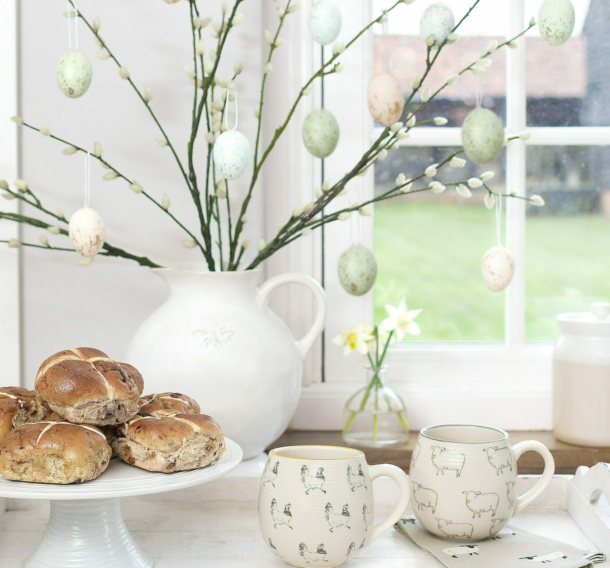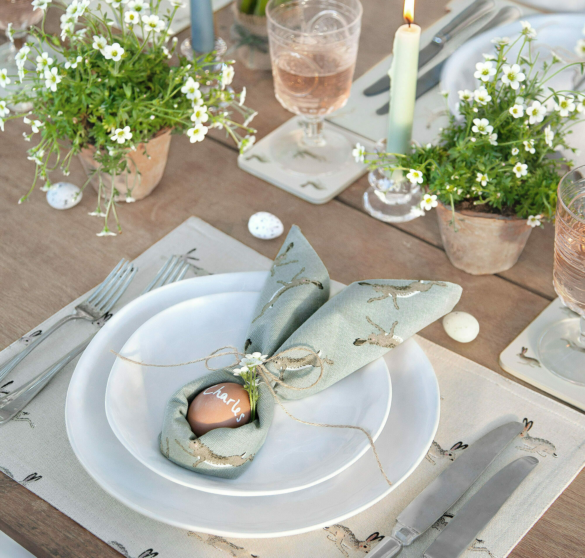 When it comes to styling your spring tablescape, lay out your placemats, napkins and table runner first – this way you can see what space you have to add extra delights! We love filling a jug with beautiful spring flowers, laying down a seasonal garland, and dotting decorations that add a playful element. Hot cross buns and mini eggs make an added bonus and provide delicious treats for guests. For a little bit of added creativity, play around with your napkins - we love these bunny-shaped napkins as they always go down a treat.